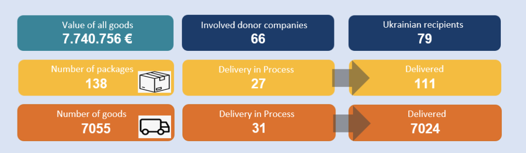 If the donation hub and the procurements in the solidarity utility partnerships are added together, goods worth a total of over EUR 7.7 million were donated and procured for Ukraine via the Utility Platform. A total of 66 German companies were involved in procurements and donations. 79 different Ukrainian companies have benefited from donations and procurements.
